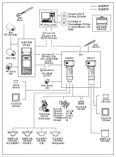 硬盒CR-A103、RS-232C线缆CR-A102(连接PC)、粉体单元CR-A50、CR-400实用软件CR-S4w、色彩管理软件SpectraMagic NX CM-S100w、带玻璃罩的遮光筒CR-A33e