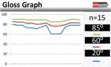 镜向光泽度-该仪器显示的是表面17-23°的反射面。图中曲线的形状描述了光和表面的相互影响。接近镜面的曲线的急转弯说明了表面光滑的高反射。